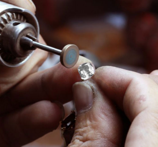 After planning out the process the next step is to start making the cuts firstly removing the non-diamond material from the surface and then starting to make cuts to develop the intended final shape of the piece.