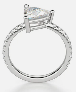You won't generally see a triangular main diamond on a piece of jewelry but you may see accents that bare a triangular shape. If you see this you are probably looking at trillion-cut diamond accents. These are commonly found as flanking stones either in a row on the flanks or as the smaller side diamonds for a three-stone setting ring.
