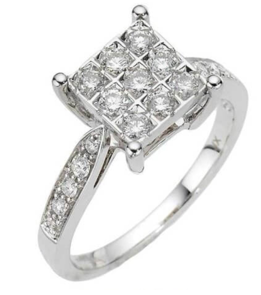 At a glance a cluster setting may look like one large diamond which is impressive but it is in fact several closely packed as the central focal point. The effect of these diamonds is not as visually stunning as a larger single diamond as they lack less fire and brilliance together.