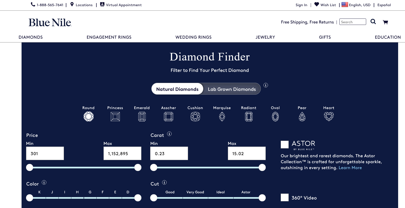 Blue Nile has its own version of the sliding bar search engine that helps you search for diamonds based on price, color, clarity, carats shape and cut quality. It is very much like the Allen James set up.