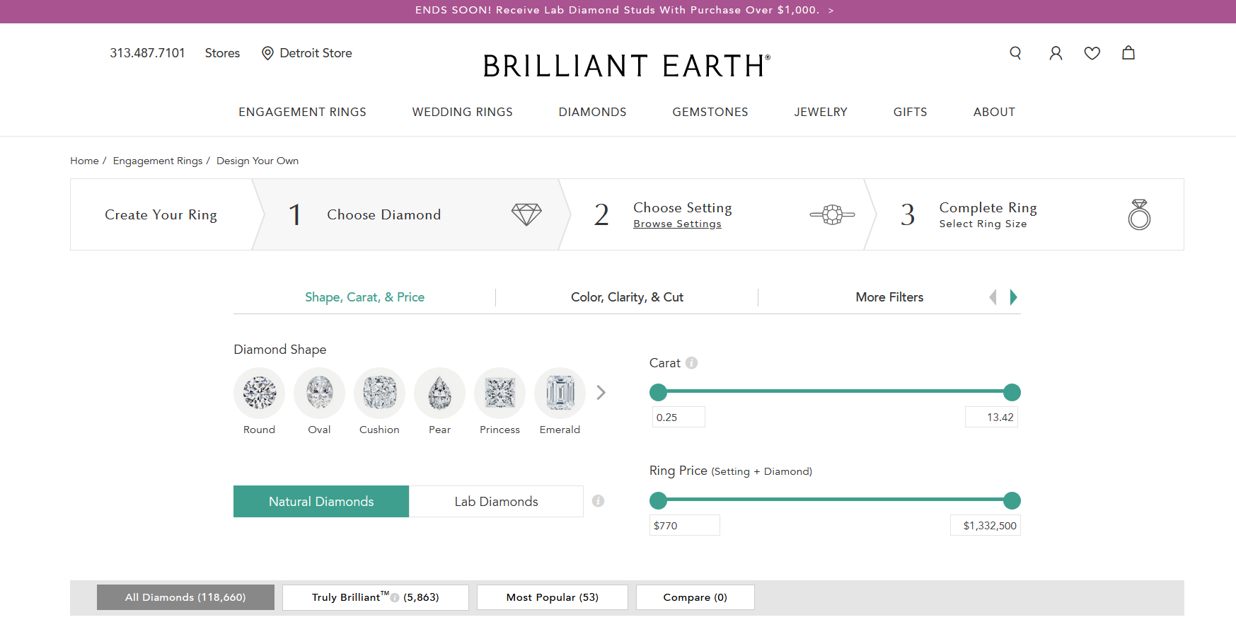 Just like their competitors Brilliant Earth has a fantastic detailed search engine that can help customers peruse the best diamonds they have to offer. Using the standard search parameters associated with diamonds you can quickly narrow down your options and find a fantastic diamond.