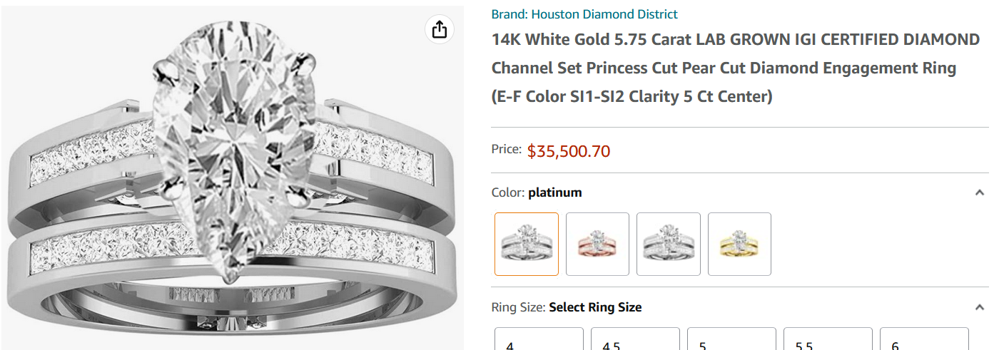 A quick search using the term “engagement ring” produced 60,000 listings with a low priced engagement/wedding band set being available for under $9. The highest priced option was from Houston Diamond District featuring a lab-grown 5.75 carat diamond costing over $35,000.