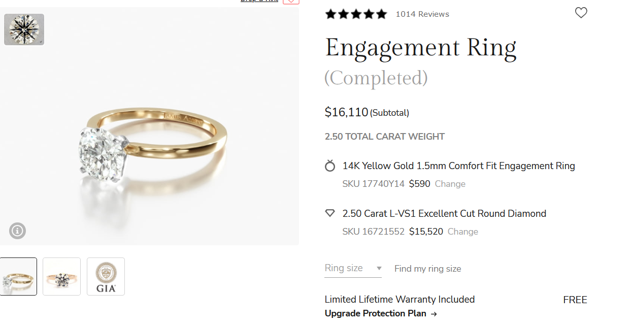 Our next step was to visit James Allen and create an engagement ring using their search engine to see how much something comparable would cost at one of the big online jewelry dealers. The table below will compare the qualities of both pieces and finally their cost.
