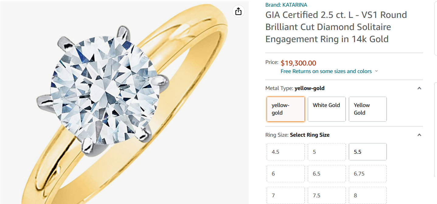 A search on April 11th 2023 showed some 40 main sellers offering engagement rings on Amazon with the most expensive rings coming from a company calling themselves the Houston Diamond District. Alarmingly these high priced options often do not offer graded reports to support the quality of the diamonds in the ring.